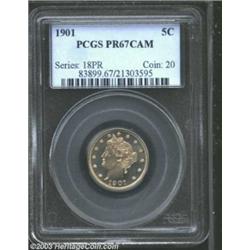 <TABLE cellSpacing=0 cellPadding=0 width="100%" bgColor=#000000 border=0><TBODY><TR><TD width="100%"><TABLE cellSpacing=1 cellPadding=3 width="100%" border=0><TBODY><TR><TD width="100%" bgColor=#79735c><FONT face=arial color=#ffffff size=3><B>Description</B> </FONT></TD></TR><TR><TD width="100%" bgColor=#ffffff><FONT face=arial size=2><B>1901 5C PR67 Cameo PCGS.</B></I> Lovely streaks of honey-gold patina endow this razor-sharp and seemingly pristine Superb Gem. The grains of corn within the wreath are exceptionally clear, and a finer specimen can hardly be imagined. A solitary PR67 Deep Cameo piece is the only one graded higher by PCGS. Population: 3 in 67 Cameo (4/03). </FONT></TD></TR></TBODY></TABLE></TD></TR></TBODY></TABLE><BR><A name=PricesRealized></A><TABLE cellSpacing=0 cellPadding=0 width="100%" bgColor=#000000 border=0><TBODY><TR><TD width="100%"><TABLE cellSpacing=1 cellPadding=3 width="100%" border=0><TBODY><TR><TD width="100%" bgColor=#79735c><A name=PR><FONT face=arial color=#ffffff size=3><B>Previous Prices from Heritage Auctions</B> </FONT></A></TD></TR><TR><TD bgColor=#f6f6ed>No Prior Data Recorded </TD></TR><TR><TD bgColor=#ffffff><FONT face=arial size=1 ?>PLEASE NOTE: All prices realized reflect the final hammer price PLUS the buyer's premium in auctions that charge a buyer's premium. Each item has a notation at the top of the listing indicating whether that lot included a buyer's premium. Example: A item that sells with a final hammer price of $100 and a 20% buyer's premium will display with a price realized of $120. All information listed is intended to be as accurate as possible, but errors are possible. Please use this guide carefully and inform us of any inaccuracies. </FONT></TD></TR></TBODY></TABLE></TD></TR></TBODY></TABLE><BR><TABLE cellSpacing=0 cellPadding=0 width="100%" bgColor=#000000 border=0><TBODY><TR><TD width="100%"><TABLE cellSpacing=1 cellPadding=3 width="100%" border=0><TBODY><TR><TD width="100%" bgColor=#79735c colSpan=6><FONT face=arial color=#ffffff size=3><B>Price Guide*</B> </FONT></TD></TR><TR bgColor=#f6f6ed><TD align=middle><B>Grade</B> </TD><TD align=middle><B>Coin World<BR>(Trends)</B> </TD><TD align=middle><B>Numismedia<BR>Retail</B> </TD><TD align=middle><B>Numismedia<BR>Wholesale</B> </TD><TD align=middle><B>Coin<BR>Universe</B> </TD><TD align=middle><B>Heritage<BR>Value Index</B> </TD></TR><TR bgColor=#ffffff><TD align=middle>66</TD><TD align=right>---</TD><TD align=right>---</TD><TD align=right>---</TD><TD align=right>---</TD><TD align=right>---</TD></TR><TR style="FONT-WEIGHT: bold" bgColor=#cccfdd><TD align=middle>67</TD><TD align=right>---</TD><TD align=right>---</TD><TD align=right>---</TD><TD align=right>---</TD><TD align=right>---</TD></TR><TR bgColor=#ffffff><TD align=middle>68</TD><TD align=right>---</TD><TD align=right>---</TD><TD align=right>---</TD><TD align=right>---</TD><TD align=right>---</TD></TR><TR bgColor=#ffffff><TD colSpan=6><FONT size=1>*All information listed is intended to be as accurate as possible, but errors are possible. No item may be returned or refused based on this information which is provided as a service to our customers. You should contact each pricing source directly to determine the accuracy of this information. </FONT></TD></TR></TBODY></TABLE></TD></TR></TBODY></TABLE><BR><TABLE cellSpacing=0 cellPadding=0 width="100%" bgColor=#000000 border=0><TBODY><TR><TD width="100%"><TABLE cellSpacing=1 cellPadding=3 width="100%" border=0><TBODY><TR><TD width="100%" bgColor=#79735c><FONT face=arial color=#ffffff size=3><B>Population Guide</B> </FONT></TD></TR><TR bgColor=#ffffff><TD align=middle><!-- Begin Output of Population Grid--><TABLE cellSpacing=0 cellPadding=0 width="100%" border=0><TBODY><TR><TD vAlign=center><TABLE cellSpacing=0 width="100%" border=1 cellsadding="3"><TBODY><TR><TD vAlign=center><TABLE cellSpacing=0 cellPadding=3 width="100%" border=1><TBODY><TR><TD vAlign=center align=middle bgColor=#f0f1e8 colSpan=2 <CENTER><FONT face=Arial size=2><B>PCGS Pop </B></FONT><CENTER></CENTER></TD><TD vAlign=center align=middle bgColor=#f0f1e8 colSpan=2><CENTER><FONT face=Arial size=2><B>NGC Pop</B></CENTER></FONT></TD></TR><TR><TD vAlign=center><FONT face=Arial size=2>(67)</FONT> </TD><TD vAlign=center align=right><FONT face=Arial size=2>0</FONT> </TD><TD vAlign=center><FONT face=Arial size=2>(67)</FONT> </TD><TD vAlign=center align=right><FONT face=Arial size=2>2</FONT> </TD></TR><TR><TD vAlign=center><FONT face=Arial size=2>(>67)</FONT> </TD><TD vAlign=center align=right><FONT face=Arial size=2>0</FONT> </TD><TD vAlign=center><FONT face=Arial size=2>(>67)</FONT> </TD><TD vAlign=center align=right><FONT face=Arial size=2>0</FONT> </TD></TR></TBODY></TABLE></TD></TR></TBODY></TABLE></TD></TR></TBODY></TABLE><!-- End Output of Population Grid--> Important notice: Heritage usually auctions material at the rate of 200-250 lots per hour. On some occasions eBay Live bid software or the Internet may not be able to keep up with the pace of the auction. We recommend placing a realistic absentee bid now as insurance to avoid disappointment. Occasionally the auctioneer may eliminate or reject an eBay Live bid, and the auctioneer may also reopen a lot after the close of the eBay live bidding (usually because we missed an audience bid), and may reject your bid even if it shows you as the winning bidder. By bidding via eBay Live, you agree that Heritage may award the lot to another bidder at its sole discretion under the circumstances described above or any other reasonable circumstances. Also please note that all Heritage lots purchased through eBay Live carry a 20% Buyer's Premium. Please make sure you read the Terms and Conditions before you bid.</TD></TR></TBODY></TABLE></TD></TR></TBODY></TABLE>