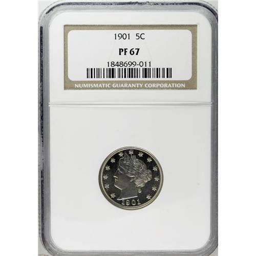 <B>1901 5C PR67 NGC.</B></I> Reflective, near-pristine proof surfaces exhibit just a whisper or two of color on the reverse. All of the design elements are well brought up. Census: 28 in 67, 3 finer (10/06).<BR><BR><b>Shipping:</b> Coin/Currency (<a target="_blank" href="http://www.heritageauctions.com/common/shipping.php">view shipping information</a>)