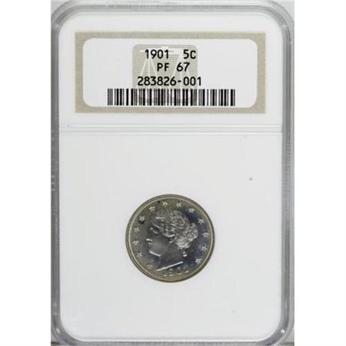 <B>1901 5C PR67 NGC.</B></I> A strongly reflective, decisively struck example of this mid-date issue. The outer zones exhibit moderate-thickness olive-gold patina, while the centers are largely untoned. Census: 27 in 67, 3 finer (5/07).<BR><I>From The Vanek Collection.</B></I><BR><BR><b>Shipping:</b> Coins & Currency (<a target="_blank" href="http://www.heritageauctions.com/common/shipping.php">view shipping information</a>)