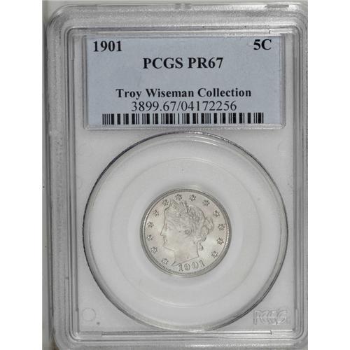 <B>1901<5C> PR67 PCGS.</B></I> Sharply defined, though the reflectivity is slightly shallow, and immaculately preserved. A largely untoned piece, tied for the finest non-Cameo specimen certified by PCGS (8/06).<BR><I>From The Troy Wiseman Collection.</B></I>