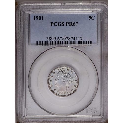 <B>1901<5C> PR67 PCGS.</B></I> Fully struck and seemingly pristine, with glittering proof surfaces that display watery reflectivity in the dark fields. A pleasing, mild cameo-like effect is noted on each side. Population: 22 in 67, 0 finer (4/06).