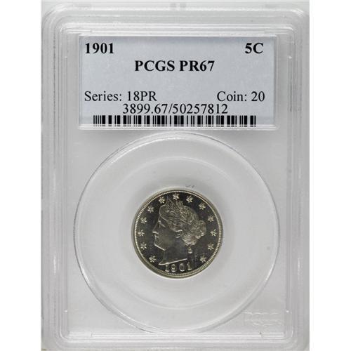 1901 5C PR67 PCGS. The obverse is virtually brilliant,