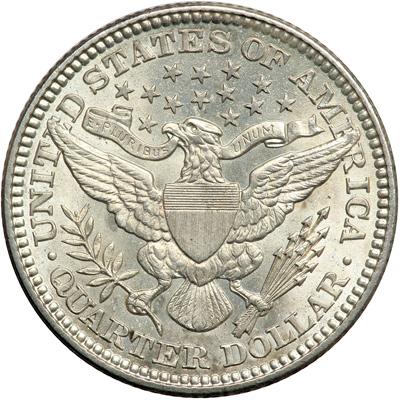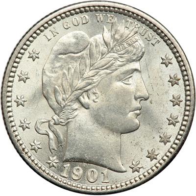 1901 Barber Quarter Dollar. PCGS graded MS-63. A frosty example kept out of a higher grade designation by a fine scuff in the luster before the face. Well struck and beaming (PCGS # 5628) .