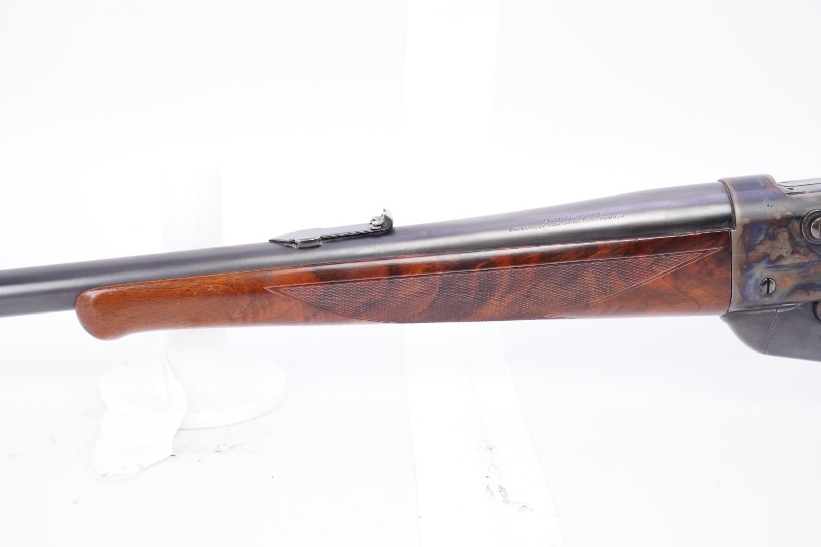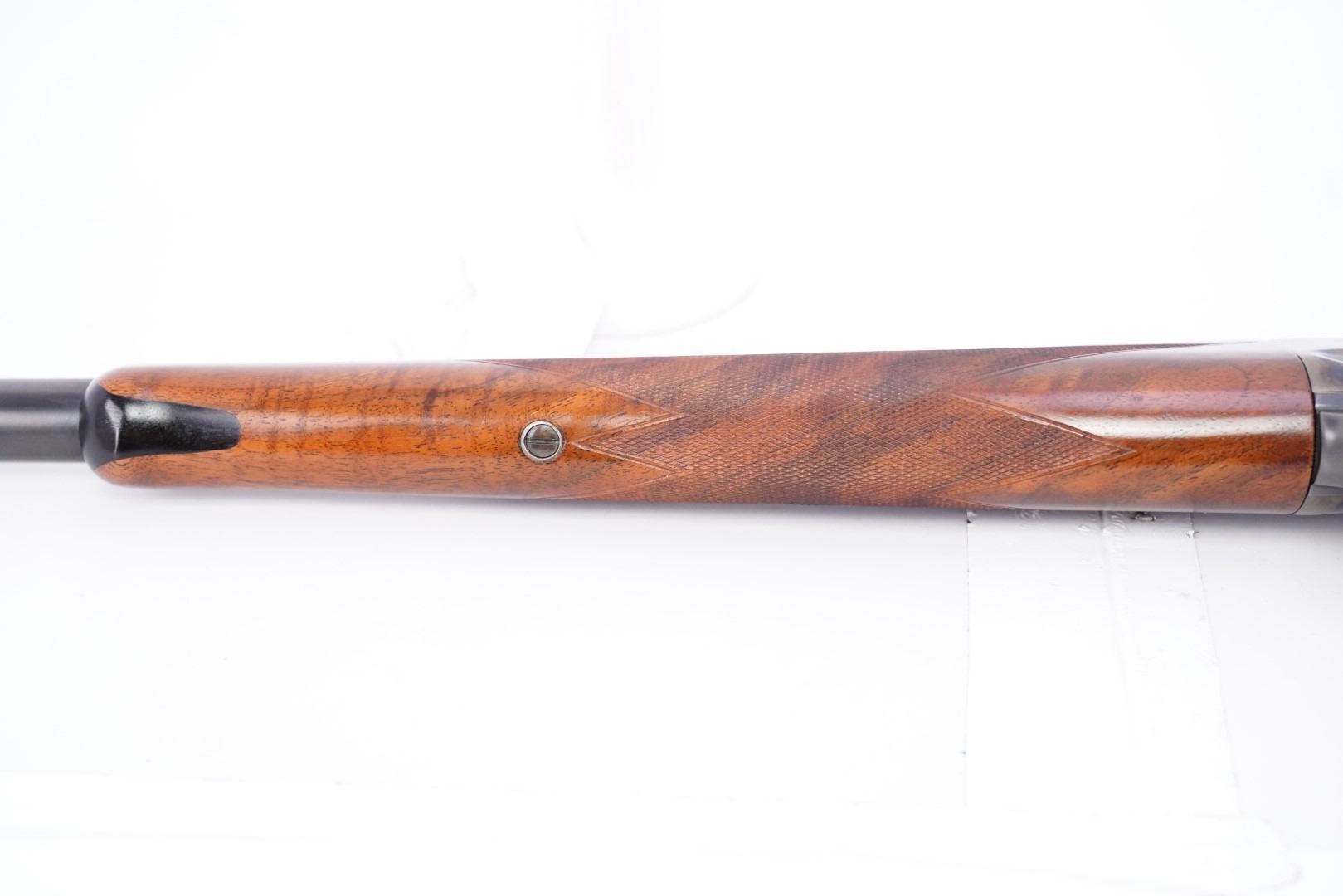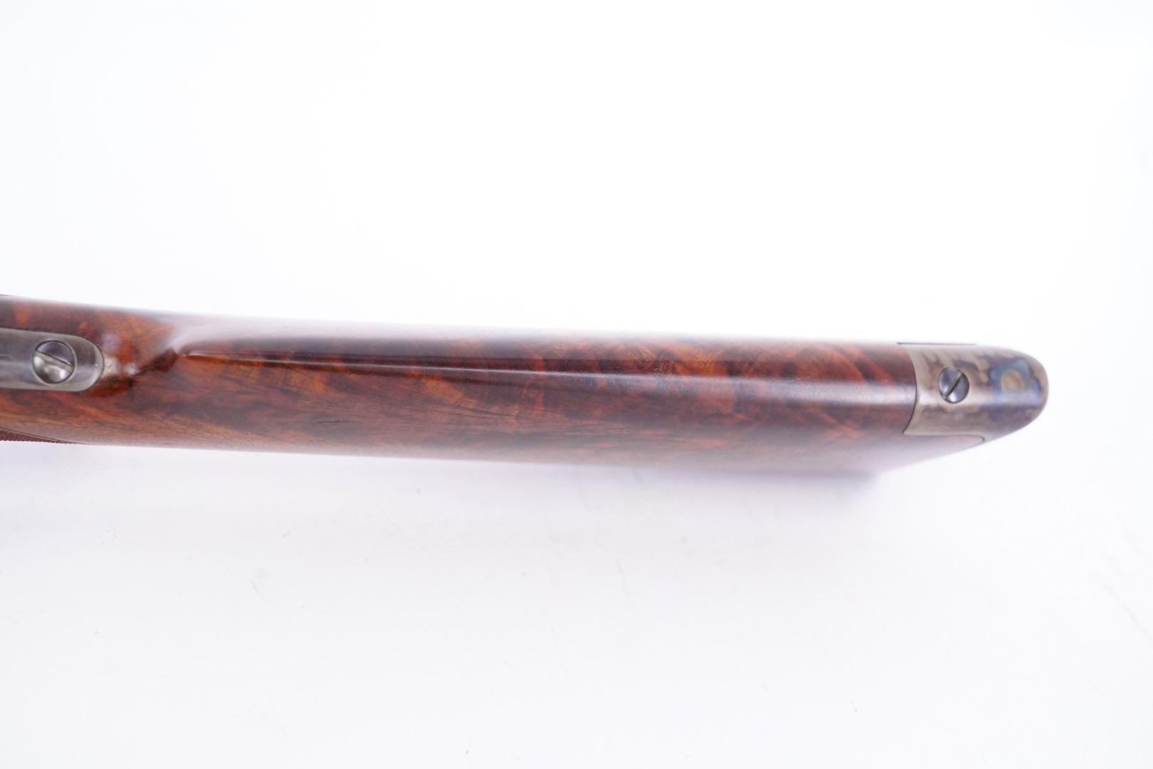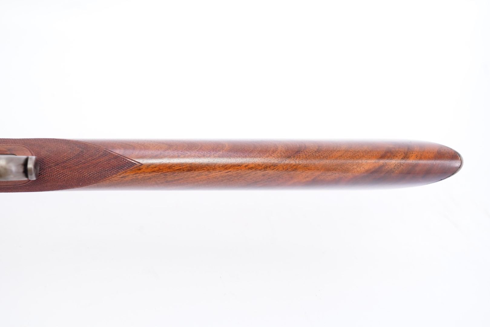 Stock Configuration & Condition: The stocks are two-piece checkered deluxe walnut with schnabel forend, straight grip, straight comb and case color steel crescent buttplate. There is a triangular ebony inlay in the forend tip. The stocks have a couple of little marks through the finish and minor draglines. The checkering is well defined. There are no chips or cracks. The LOP measures 12 1/2" from the front of the trigger to the back of the buttplate. The stocks rate in about Fine-excellent overall condition as restored.