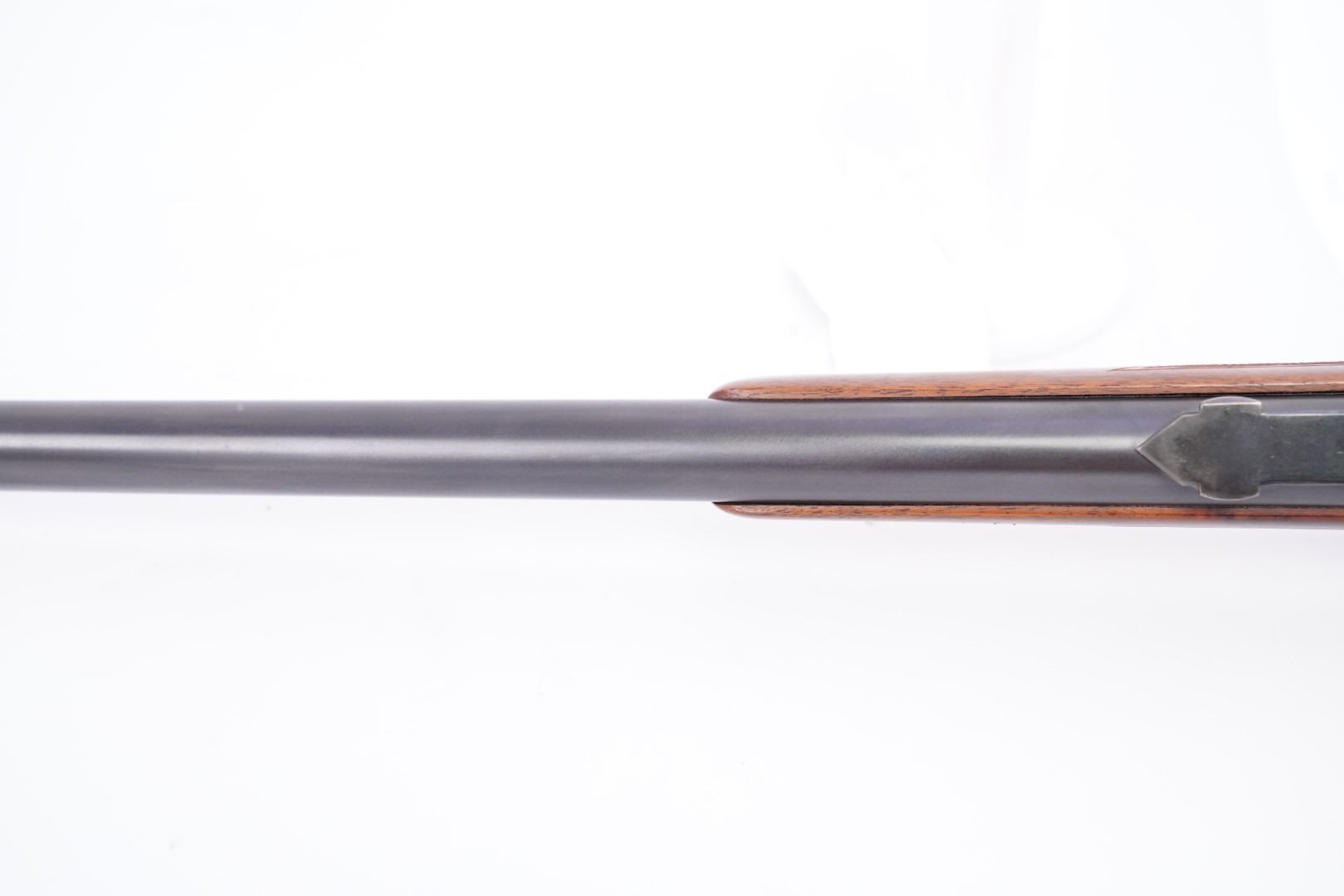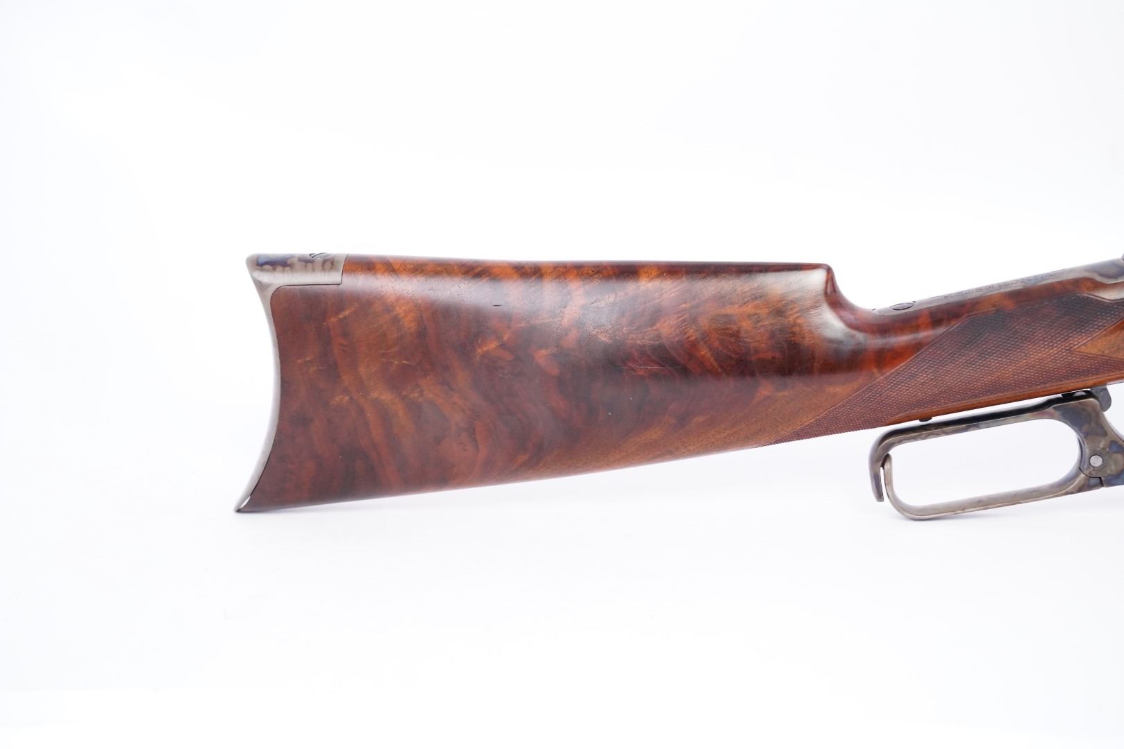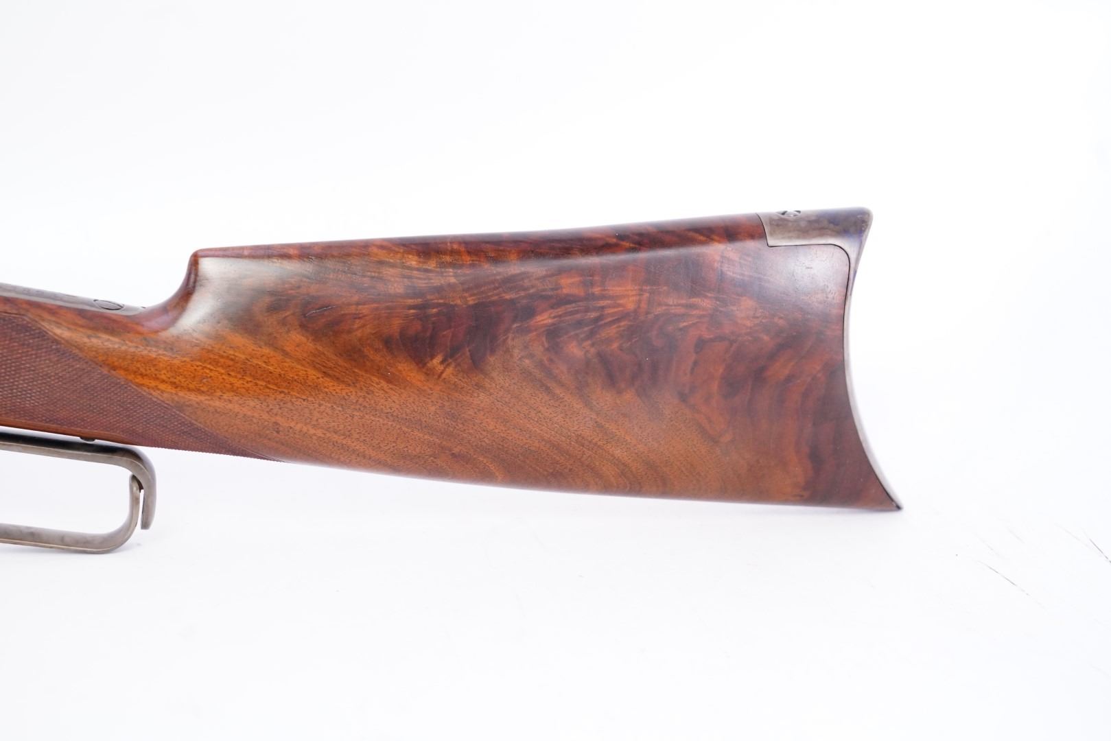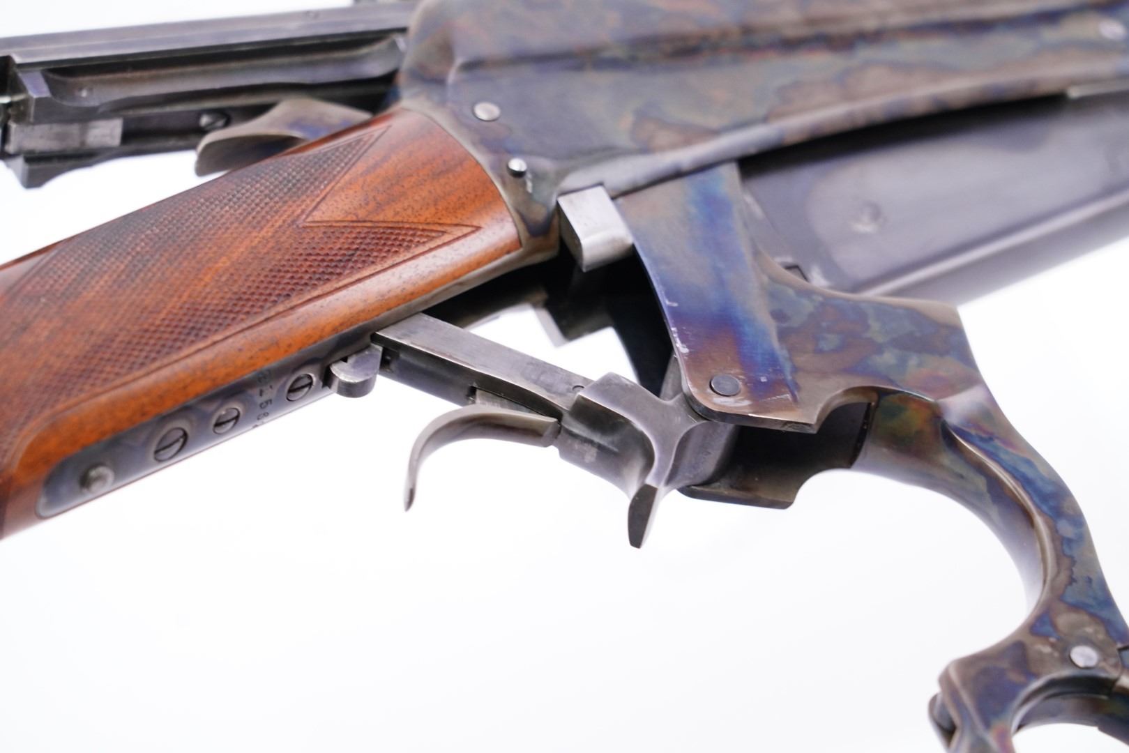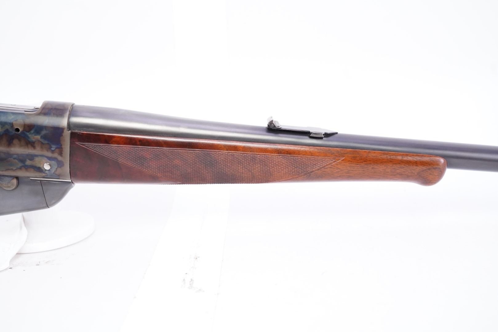 Stock Configuration & Condition: The stocks are two-piece checkered deluxe walnut with schnabel forend, straight grip, straight comb and case color steel crescent buttplate. There is a triangular ebony inlay in the forend tip. The stocks have a couple of little marks through the finish and minor draglines. The checkering is well defined. There are no chips or cracks. The LOP measures 12 1/2" from the front of the trigger to the back of the buttplate. The stocks rate in about Fine-excellent overall condition as restored.