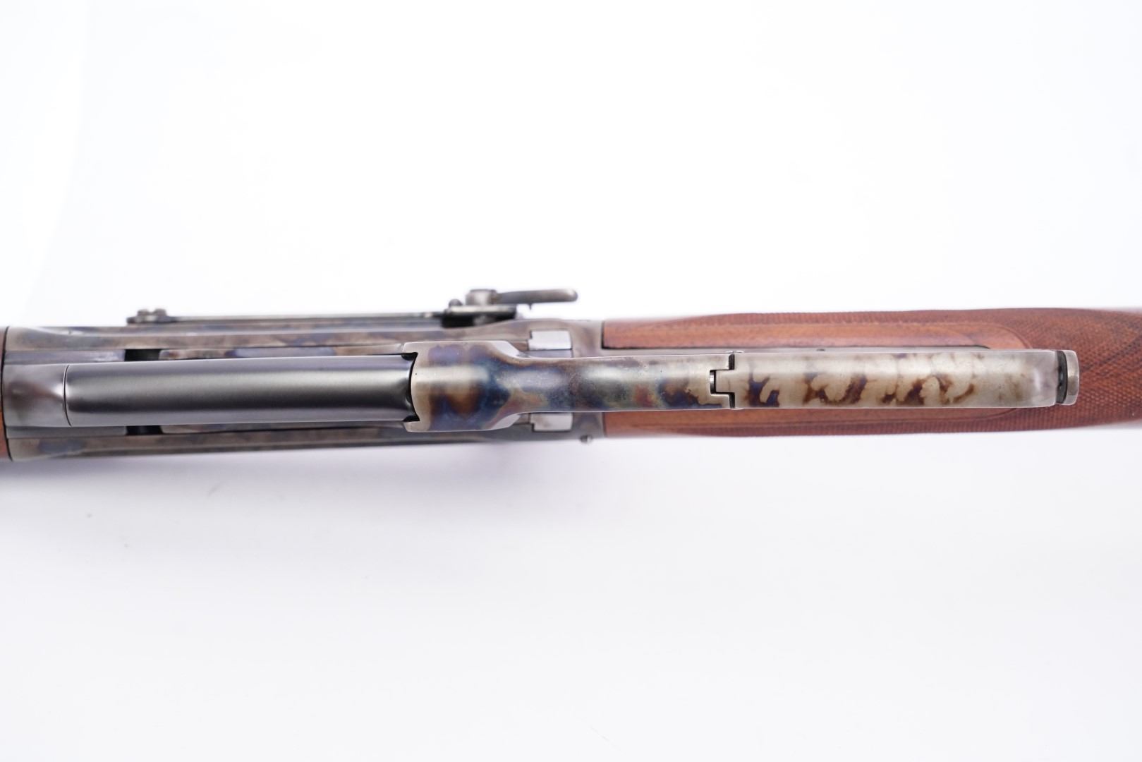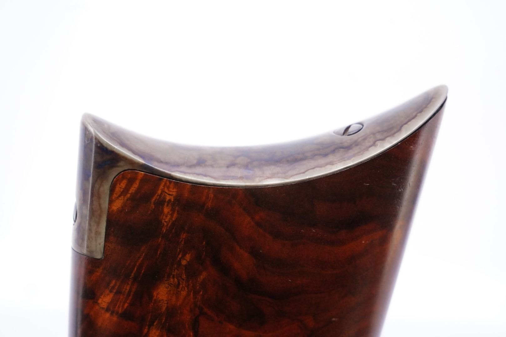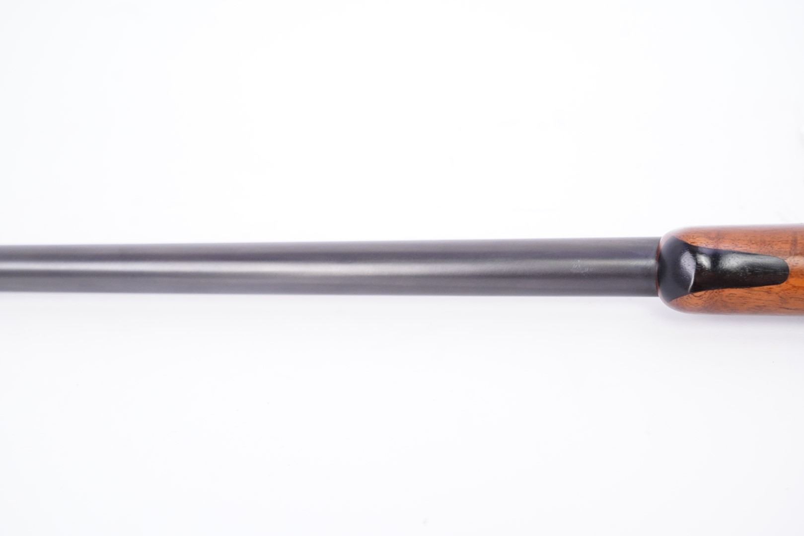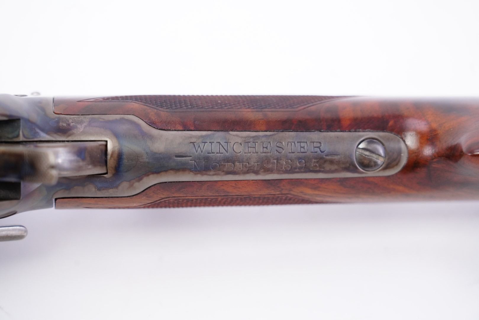 Stock Configuration & Condition: The stocks are two-piece checkered deluxe walnut with schnabel forend, straight grip, straight comb and case color steel crescent buttplate. There is a triangular ebony inlay in the forend tip. The stocks have a couple of little marks through the finish and minor draglines. The checkering is well defined. There are no chips or cracks. The LOP measures 12 1/2" from the front of the trigger to the back of the buttplate. The stocks rate in about Fine-excellent overall condition as restored.