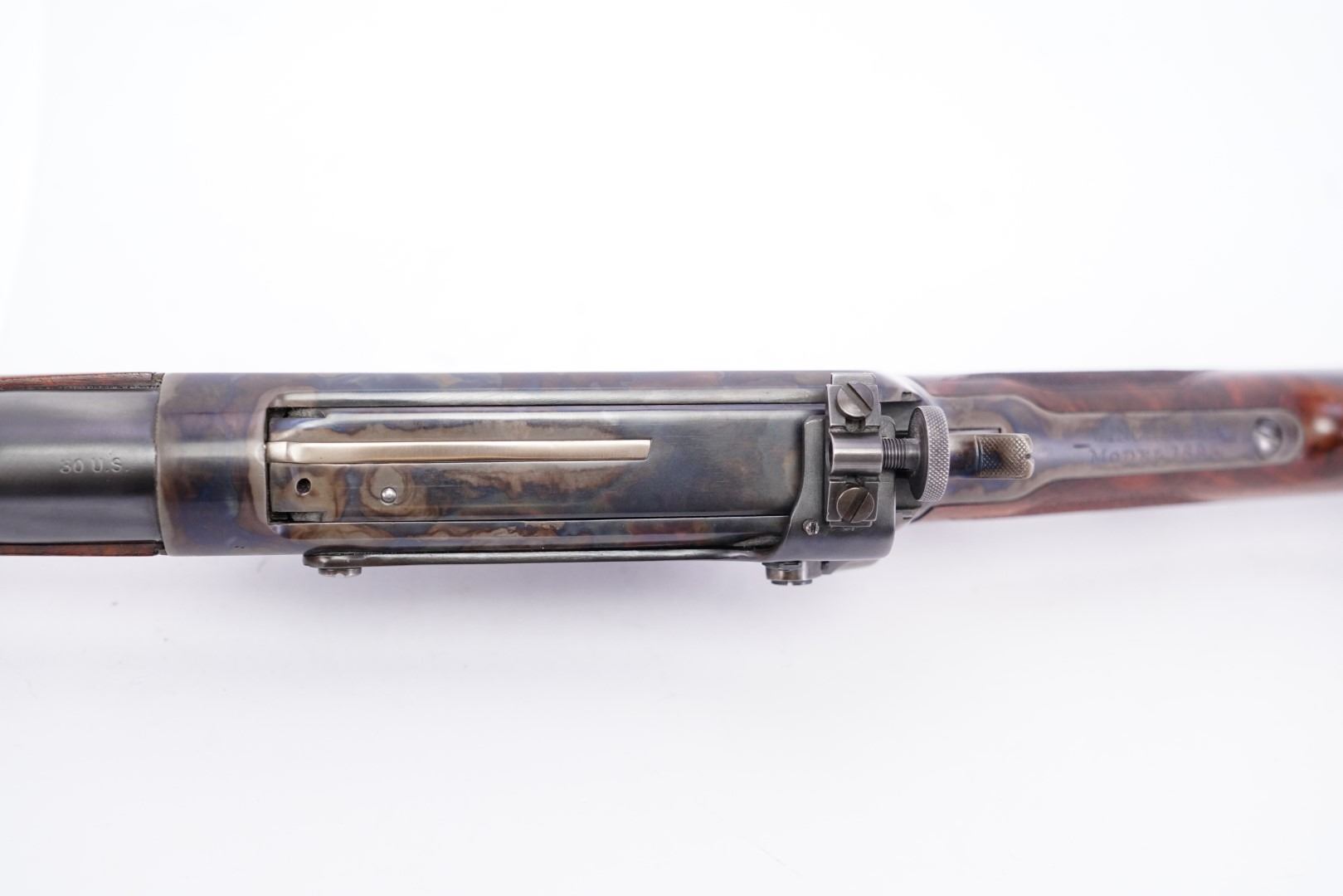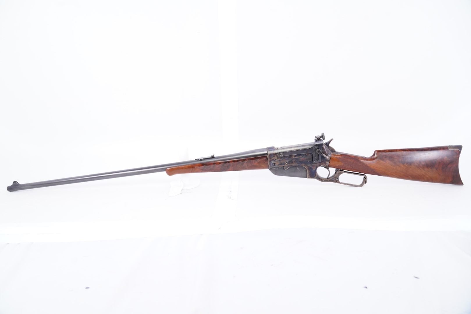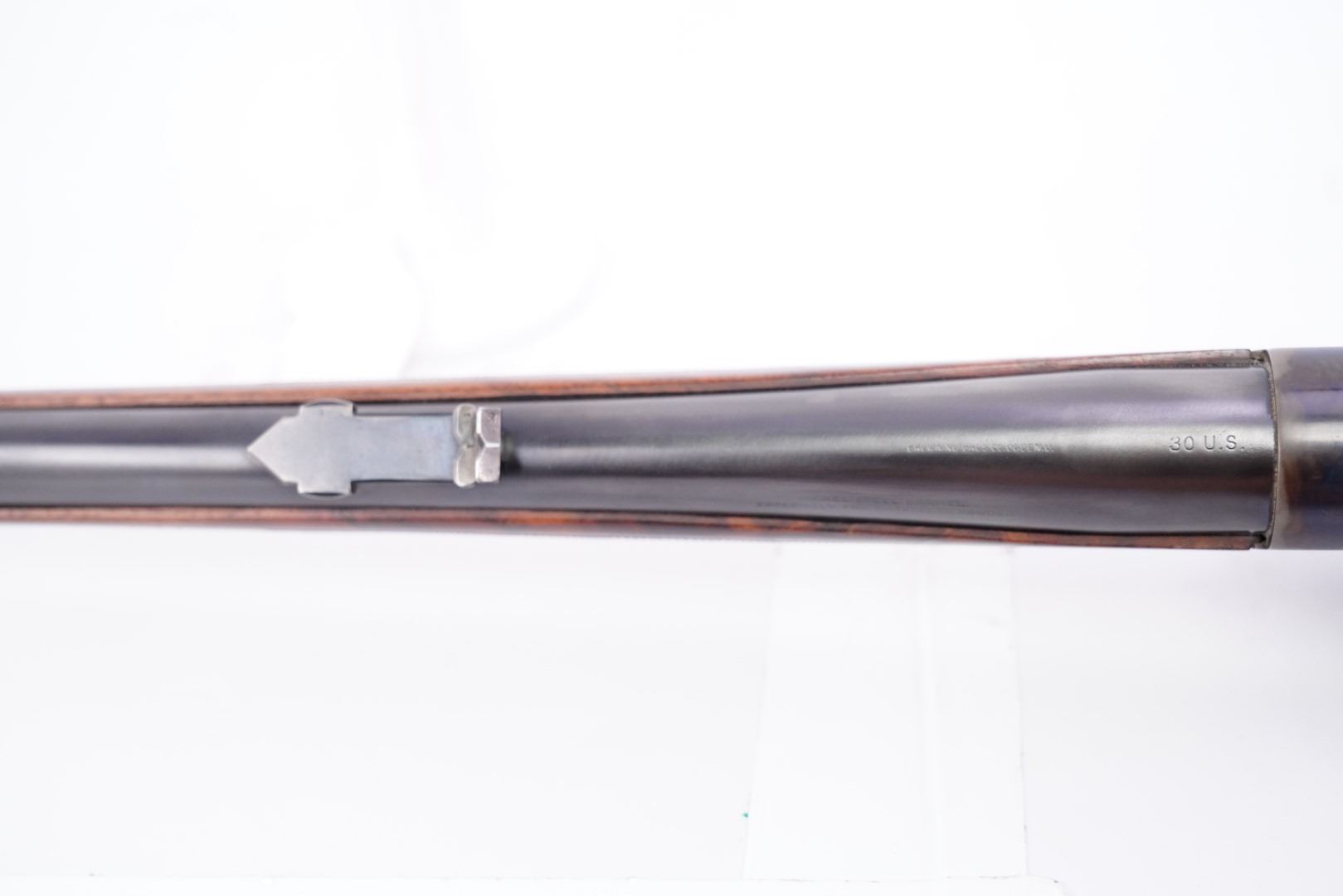 Overall Condition: This rifle retains about 95% of its current metal finish. There are some scattered little marks and areas of surface erosion under the finish. There are some scattered areas of light thinning. There is some mottled discoloration on the barrel at the front. The screw heads range from sharp to tool marked with strong slots. The markings are worn, but legible. Overall, this rifle rates in about Fine condition as restored.