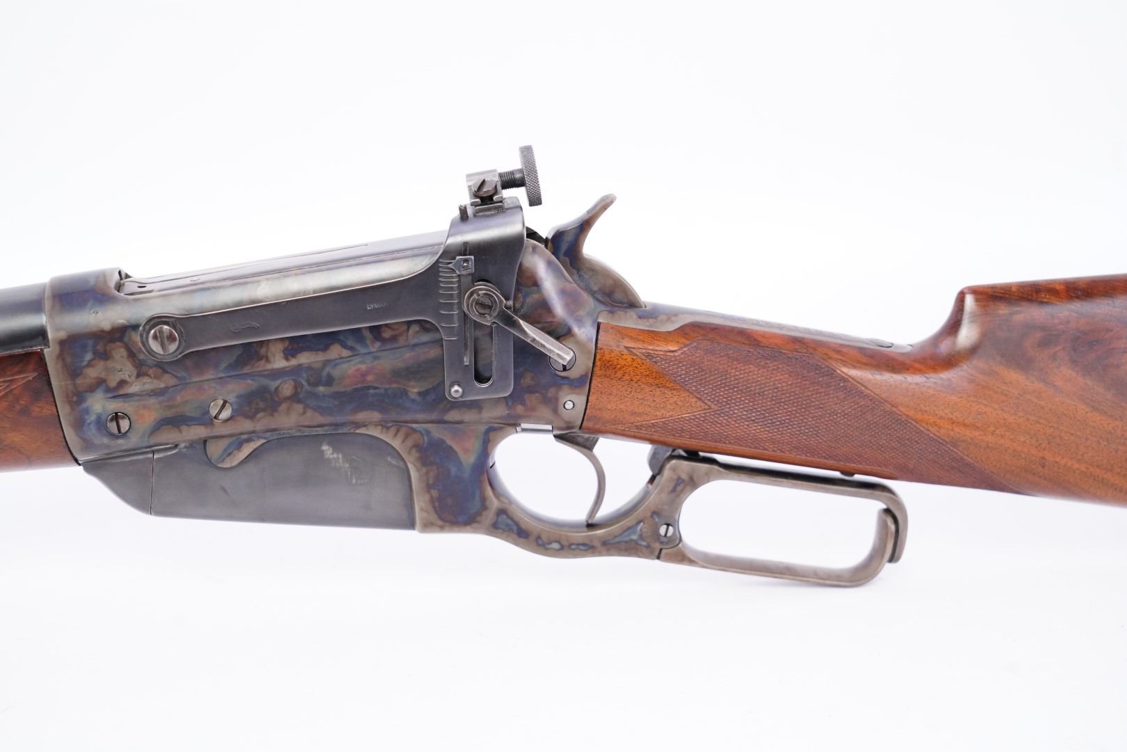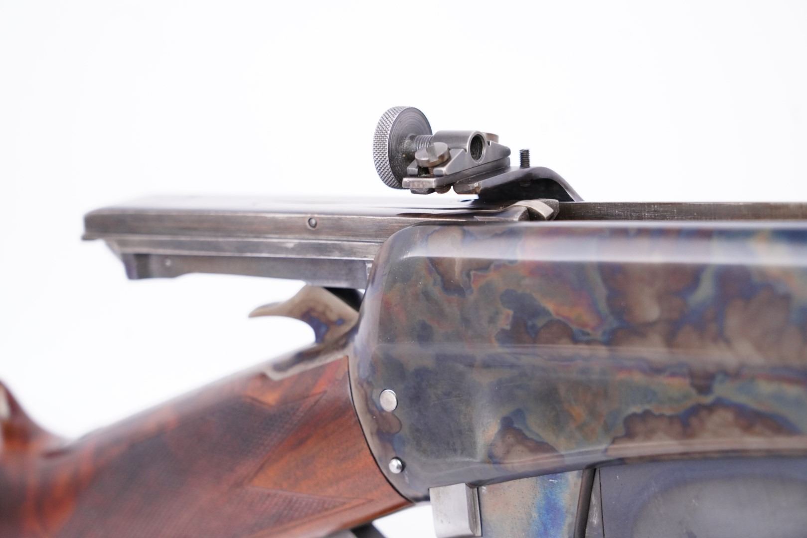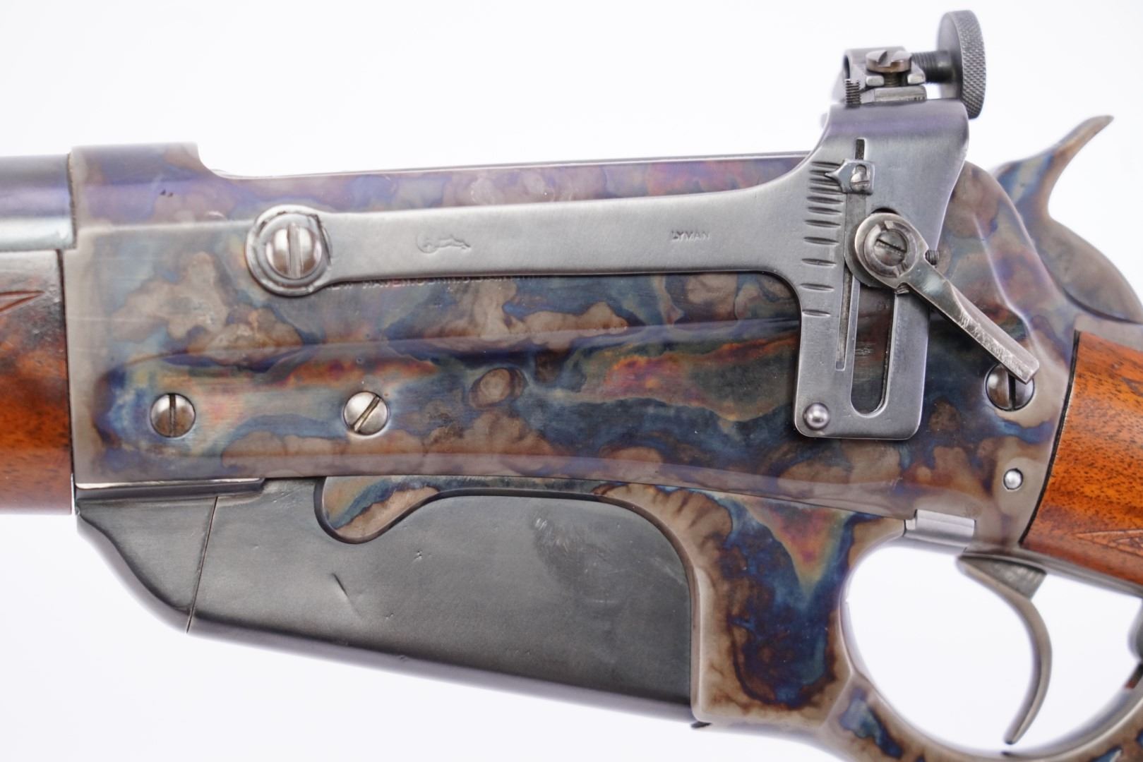 Sights / Optics: The front sight is a blade pinned to a slotted base fixed to the front of the barrel, its bead is missing. The rear sight is a three-leaf folding express-style sight dovetailed to the rear of the barrel. The left of the receiver is drilled and tapped for the installed Lyman receiver sight which has been refinished.