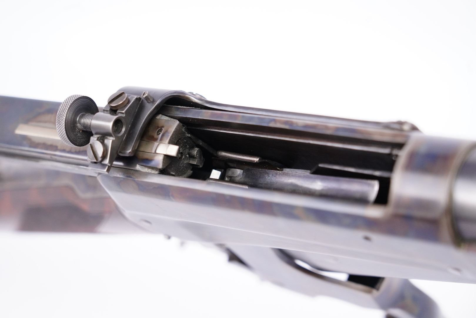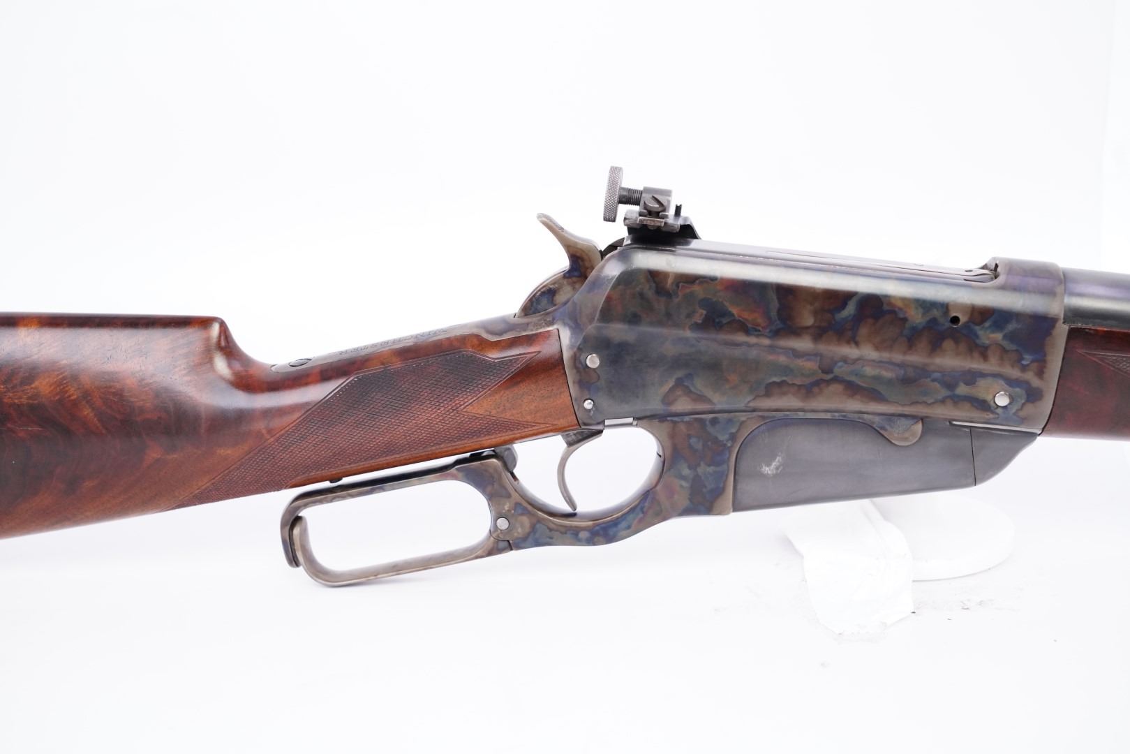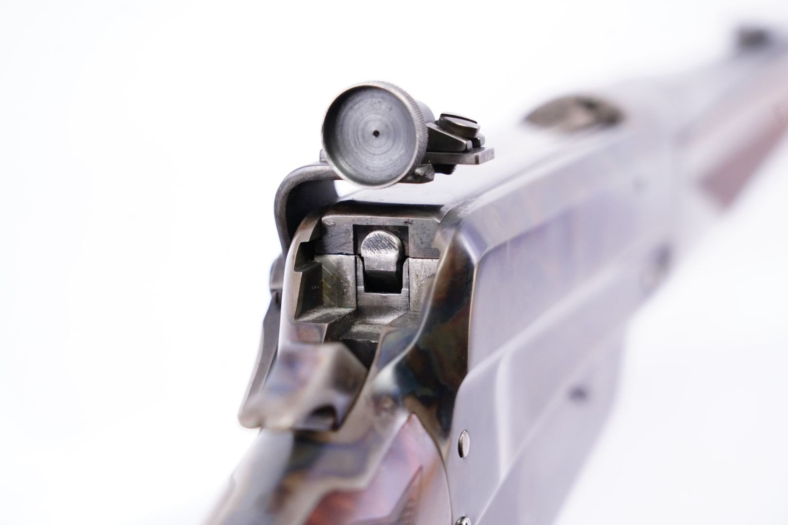 Sights / Optics: The front sight is a blade pinned to a slotted base fixed to the front of the barrel, its bead is missing. The rear sight is a three-leaf folding express-style sight dovetailed to the rear of the barrel. The left of the receiver is drilled and tapped for the installed Lyman receiver sight which has been refinished.