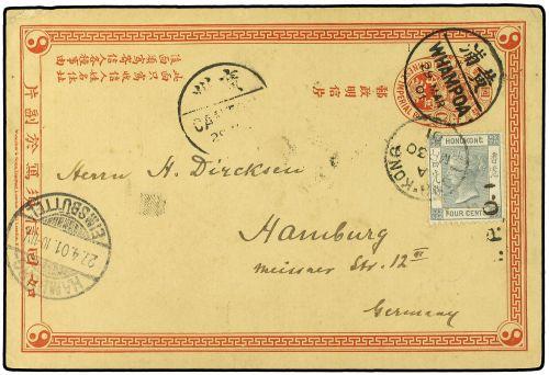 1901 Chinese Imperial Post postal stationary card one cent red written from Whampoa and cancelled by WHAMPOA imperial post datestamp, routed via Canton and Hong Kong bearing Hong Kong 4 cents grey (SG 34) tied by boxed I.P.O. Tie Print of Canton (Webb Canton Type 1) with HONG KONG datestamp, addressed to Germany with HAMBURG arrival. A wonderful mixed combination.