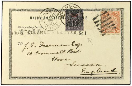 1901 Combination postcard to Sussex with China CIP 5c c. pink tied by ´Pa-kua´ in black with France Chine 10 c. applied at Shanghai for onward transmission. Scarce straight line ´From Steamer Letter Box´ in black alongside.