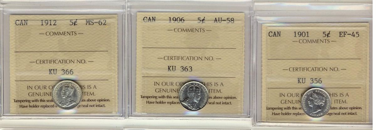 1901 EF45, 1906 AU58 & 1912 5¢ ICCS MS62. Lot of 3 coins.
