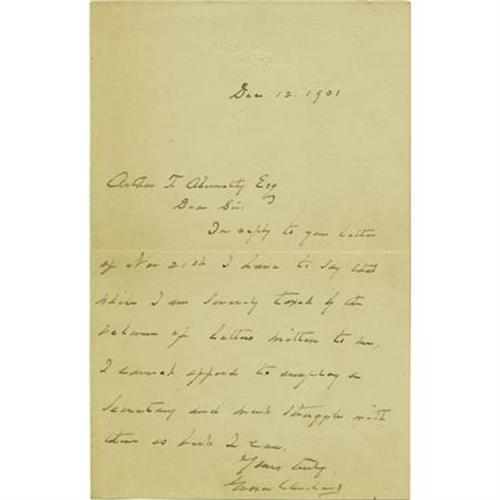 <B>1901 Grover Cleveland Autograph Letter Signed</B></I> “<I>Grover Cleveland</B></I>”. One page, 4.5” x 7”, December 12, 1901, in ink, to Arthur T. Abernathy. Grover Cleveland (1837-1908), 24th President of the United States, responds to Arthur Abernathy's application for a job as his secretary. It reads in part: “<I>In reply to your letter of Nov 31st I have to say that while I am severely taxed by letters written to me, I cannot afford to employ a secretary and must struggle with them as best I can.</B></I>” Cleveland was well into retirement by this time at his manor in Princeton, New Jersey. The letter has the usual fold marks, else in very good condition. <I>From the collection of Henry E. Luhrs.</B></I><BR><BR><b>Shipping:</b> Flat Material, Small (<a target="_blank" href="http://www.heritageauctions.com/common/shipping.php">view shipping information</a>)