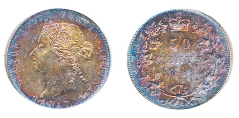 1901. ICCS Mint State-60. Medium heavy to heavy deep amber toning with blue highlights. Excellent ‘eye appeal’. Tied for the third ‘Finest’ graded by ICCS.