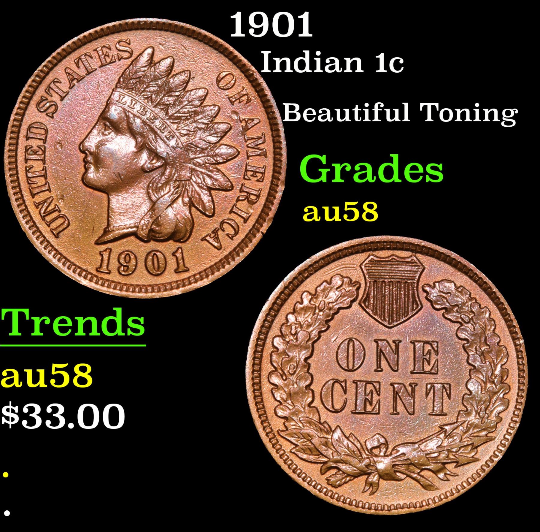 1901 Indian Cent 1c Grades Choice AU/BU Slider.        Beautiful Toning ; .