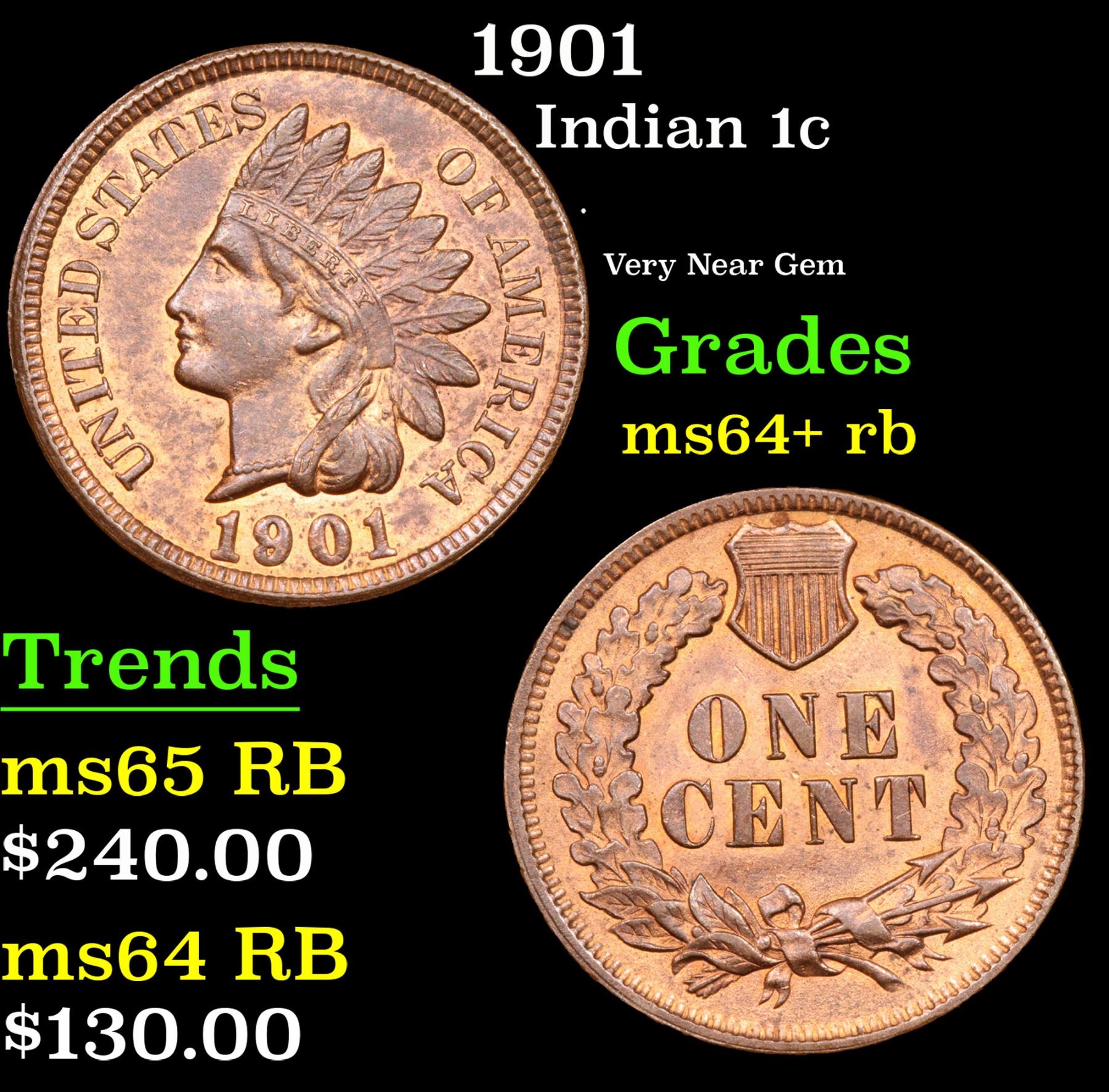 1901 . Very Near Gem Indian Cent 1c Grades Choice+ Unc RB.
