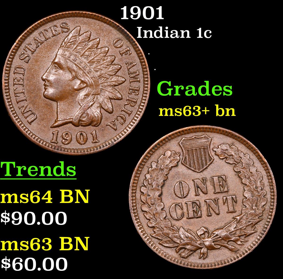 1901 . . Indian Cent 1c Grades Select+ Unc BN.