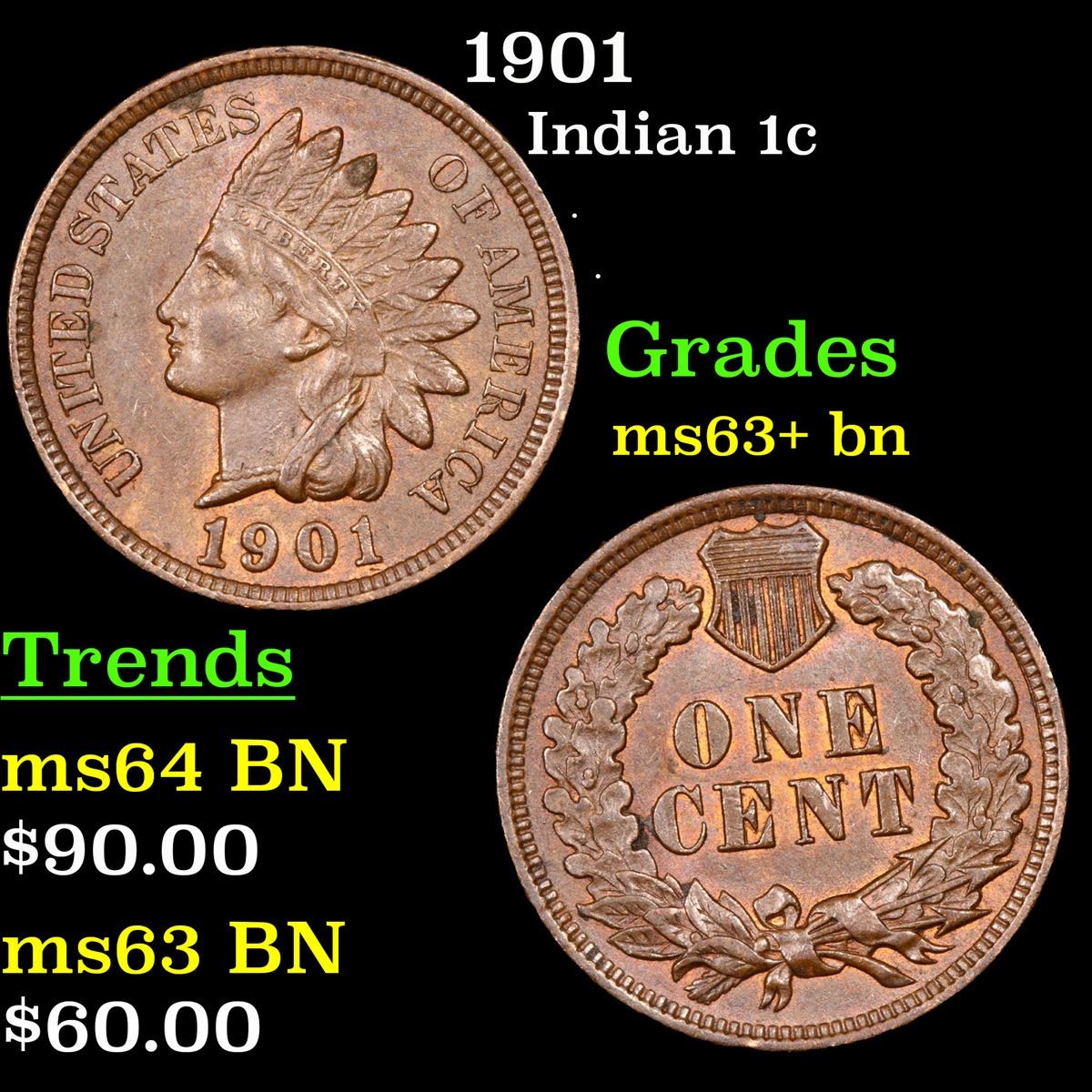 1901 . . Indian Cent 1c Grades Select+ Unc BN.