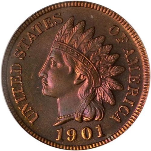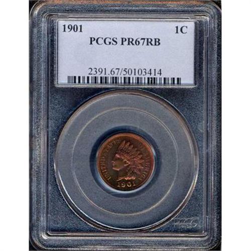 <b>1901 Indian Head Cent. PCGS graded PF67 RB.</b> Bright purple red and deep fiery copper color with glossy highlights. A spectacular gem that displays an broad amount of mirror-deep finish and physical strength. The strike is bold, not merely bold for this date but decidedly bold for any date of Proof Indian cent (some are typically found "mushy"). Proof mintage was only 1,985 pieces <b>(PCGS # 2391)</b>