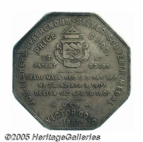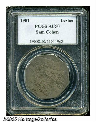 <B>1901 Lesher Referendum Dollar, Sam Cohen AU50 PCGS.</B></I> HK-793, R.7. No. 429. A very rare type with only a handful of pieces believed known. This piece has SAM COHEN first stamped inverted, then restamped correctly over the first stamping. Even, gunmetal-gray patina. Listed on page 317 of the 2005 Guide Book.<BR><I>Ex: 1977 ANA Sale (Kagin's, 8/77), lot 5360; 1999 Mid-Winter ANA Sale (Heritage, 3/99), lot 6055, where it sold uncertified for $2,645.</B></I>