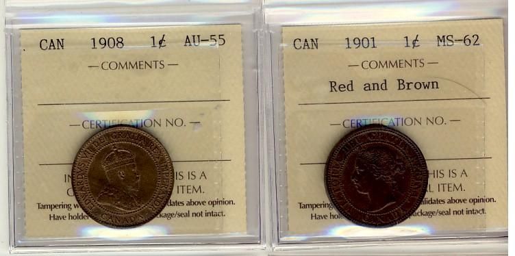 1901 MS62RB & 1908 AU55 1¢. Lot of 2 ICCS graded coins.