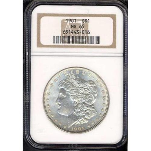 <b>1901 Morgan Dollar. NGC graded MS65.</b> A few tiny marks on the cheek and jaw. Nevertheless, a premier P-mint date among Morgan dollar rarities and the toughest of all the Philadelphia dates in Gem Uncirculated condition. We are pleased to offer an even higher graded specimen than the typically seen "choice," but dully lustrous specimen that most often makes its way to market. The surfaces here are vibrant. And also well defined beneath natural shades of toning about, on top, and throughout the devices. Underlying luster appears to be equally intense as on many earlier P-mint dates, while abrasions are extremely minimal. From just a handful of gem '01-P dollars, the occasional offering may only occur once or twice in a decade.