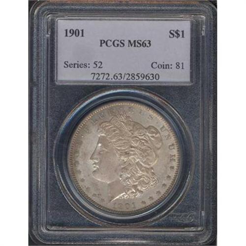 <b>1901 Morgan Dollar. PCGS graded MS63.</b> Velvety to satin-like fields almost stagger under the weight of the light to medium gray and smoke-gray silver color of this refreshingly original looking silver dollar. Mostly well struck on the legends and main device, with just a touch of weakness at the centers. There are two or three tiny marks on the face to the left of the ear, and several others (equally minor) in the fields. For some reason, most surviving Mint State 1901 P-mint dollars seem as though they were made from weakened or old dies. Why that should be has never been explained, but the coins are very scarce in choice condition.