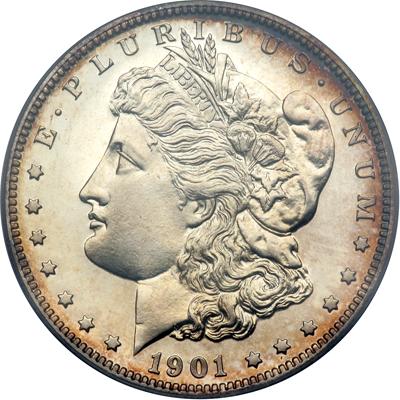 1901 Morgan Dollar. PCGS graded Proof 65 Cameo PQ. A hint of golden toning around the edges. A lovely coin. 813 Proofs minted. A fresh and original Gem quality example of this desirable date, this piece has obviously been well preserved since the day of its manufacture. Examine it thoroughly and you will come away nodding your head; it's up to future collectors to preserve it for future generations. Apart from the astounding quality of this piece, we must address the significance of this coin in relation to other known examples. Out of a mintage of 813 pieces, only a few hundred have been graded by third-party graders. Regardless of your preference for the different grading services, the general consensus is that this remarkable coin is easily one of the top ones known, as the population figures will attest, Pop 5; 6 finer in 66. (PCGS # 87336).