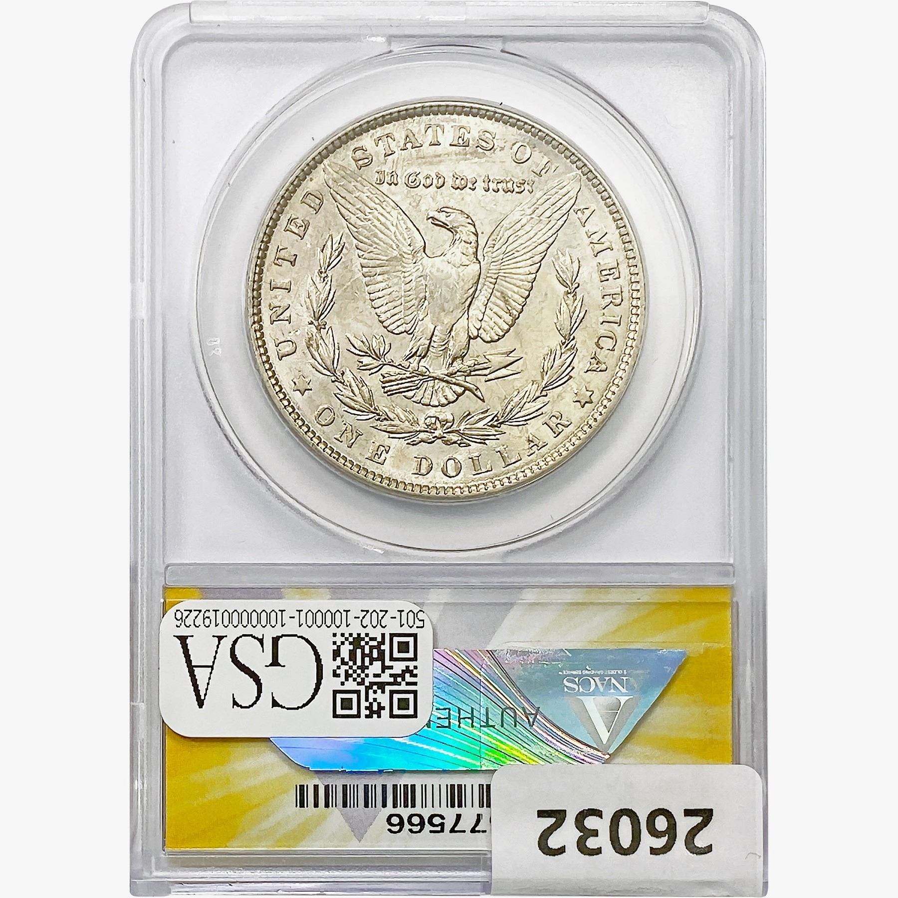 COINS AND CURRENCY LISTED IN GSA'S CATALOG AS GRADED AND ENCAPSULATED BY PCGS, NGC, ANACS, ICG, PCGS CURRENCY, PMG, PCGS BANKNOTE GRADING, CMC OR ANY OTHER THIRD-PARTY GRADING SERVICE ARE LIKEWISE SOLD "AS-IS" EXCEPT AS EXPRESSLY SET FORTH HEREIN. ALL THIRD-PARTY GRADING SERVICE GUARANTEES, INCLUDING AUTHENTICITY, ARE THE SOLE RESPONSIBILITY OF THE THIRD-PARTY GRADING SERVICE AND NOT WARRANTIES OR GUARANTEES OF GSA. BIDDERS SHOULD CONTACT THESE THIRD-PARTY GRADING SERVICES DIRECTLY WITH RESPECT TO ANY CLAIMS OR QUESTIONS THEY MAY HAVE CONCERNING THEIR GUARANTEES AND WARRANTIES. BIDDERS ACKNOWLEDGE AND AGREE THAT AUCTIONEER IS NOT BOUND BY OR LIABLE FOR ANY OPINION OR CERTIFICATION BY ANY THIRD-PARTY GRADING SERVICE. REMOVAL OF A PRODUCT FROM ITS PROTECTIVE CASING OR HOLDER OR ALTERATION OF ANY COIN HOLDER WAIVES ALL RIGHTS CONCERNING THE PRODUCT CONTAINED THEREIN.