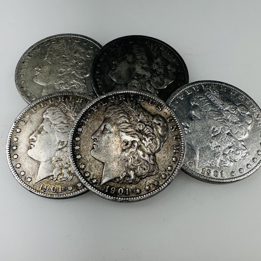 Featuring five VG+ graded coins, this 1901 Morgan Silver Dollar set brings early 20th-century coinage to your collection. Each coin reflects the timeless beauty of the Morgan design. A perfect set for adding depth and variety to your collection.