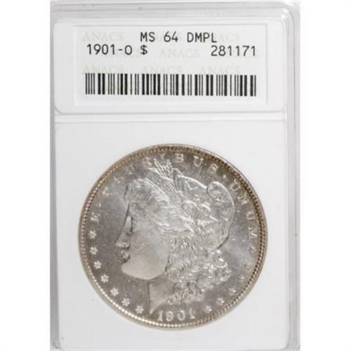 <B>1901-O $1 MS64 Deep Mirror Prooflike ANACS.</B></I> NGC Census: (44/23). PCGS Population (17/11). Numismedia Wsl. Price for NGC/PCGS coin in MS64: $825. (#97275)<BR><BR><b>Shipping:</b> Coins & Currency (<a target="_blank" href="http://www.heritageauctions.com/common/shipping.php">view shipping information</a>)