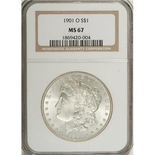 <B>1901-O $1 MS67 NGC.</B></I> Although this date is not as common as some other New Orleans issue, it is common enough that any collector can own a nice Mint State example with little difficulty. However, Superb Gem pieces are extremely rare, with just 14 pieces certified by NGC and PCGS combined. <BR> This specimen is highly lustrous with frosty silver surfaces on both sides. The brilliant white color is enhanced by the faintest champagne toning imaginable. It is a pristine example that is entirely free of surface marks. all of the design details are boldly detailed. Census: 11 in 67, 0 finer (6/07).<BR><I>From the Reuben Reinstein Collection.</B></I><BR><BR><b>Shipping:</b> Coins & Currency (<a target="_blank" href="http://www.heritageauctions.com/common/shipping.php">view shipping information</a>)
