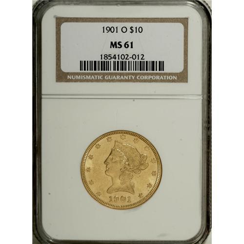 <B>1901-O $10 MS61 NGC.</B></I> NGC Census: (89/112). PCGS Population (67/150). Mintage: 72,041. Numismedia Wsl. Price for NGC/PCGS coin in MS61: $370. (#8748)<BR><BR><b>Shipping:</b> Coins & Currency (<a target="_blank" href="http://www.heritageauctions.com/common/shipping.php">view shipping information</a>)