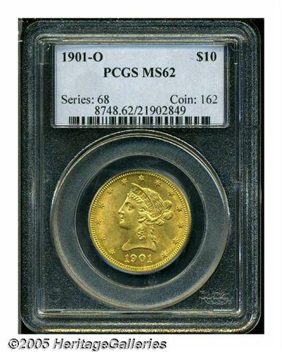 <B>1901-O<$10> MS62 PCGS.</B></I> Most known specimens of the 1901-O are in XF to AU grades. The MS62 example we offer here has a deep apricot-gold patina imbued with light green accents. Lustrous surfaces display a few minute marks, particularly on Liberty's cheek and neck and in the obverse fields. Population: 75 in 62, 54 finer (3/05).