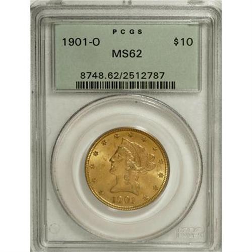 <B>1901-O $10 MS62 PCGS.</B></I> This lower mintage New Orleans eagle is well struck and lustrous. A few field marks are distributed, but the eye appeal is undeniable. Encapsulated in a green label holder.<BR><I>From The Vanek Collection.</B></I><BR><BR><b>Shipping:</b> Coins & Currency (<a target="_blank" href="http://www.heritageauctions.com/common/shipping.php">view shipping information</a>)
