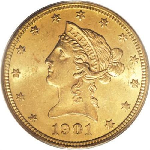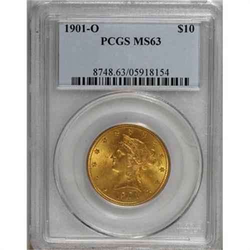 <B>1901-O $10 MS63 PCGS.</B></I> This issue ranks among just five New Orleans gold coins issued during the 20th century. The only others are the 1903-O, 04-O, and 06-O eagles, and the 1909-O half eagle. Frosty luster brings out the rich orange-gold color of this piece, with sharp design details on both sides. Few similar or finer examples have been certified by PCGS. Population: 42 in 63, 11 finer (8/07).<BR><BR><B>Coin Engraver:</B> Christian Gobrecht<BR><BR><b>Shipping:</b> Coins & Currency (<a target="_blank" href="http://www.heritageauctions.com/common/shipping.php">view shipping information</a>)