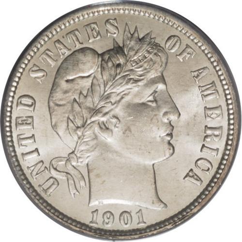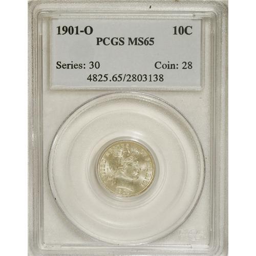 <B>1901-O 10C MS65 PCGS.</B></I> A satiny-white Gem, with excellent details that are nicely stamped onto milky-white surfaces. The scarcity of New Orleans Mint dimes from this period is deceiving. Despite reasonably high mintages, the vast majority saw extensive use in circulation and today top Mint State examples are elusive. Population: 6 in 65, 9 finer (4/07).<BR><BR><b>Shipping:</b> Coins & Currency (<a target="_blank" href="http://www.heritageauctions.com/common/shipping.php">view shipping information</a>)