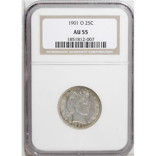 1901-O 25C AU55 NGC. Light wear is evenly distributed