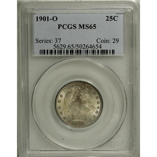 <B>1901-O 25C MS65 PCGS.</B></I> Rich olive and lilac shadings encompass this lustrous and boldly struck Gem. The mintage of 1.612 million pieces is low, even by New Orleans standards, and since few numismatists collected the series in 1901, only a few dozen pieces have survived in Mint State. Gems are undeniably rare. Population: 5 in 65, 5 finer (1/07).<BR><BR><b>Shipping:</b> Coins & Currency (<a target="_blank" href="http://www.heritageauctions.com/common/shipping.php">view shipping information</a>)