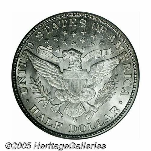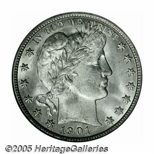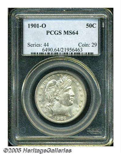 <B>1901-O<50C> MS64 PCGS.</B></I> Even though 1.1 million pieces were struck of the 1901-O, this is possibly the scarcest O-mint half from this decade. Very scarce in mint condition, and especially difficult in MS64 and better grades, only five other pieces have been so graded by PCGS with five finer, while NGC has certified 11 coins with seven finer (5/05). Brilliant throughout, the surfaces display the usual soft, satiny mint luster and show only the smallest imperfections. Sharply defined in all areas, we are tempted to call this fully struck.