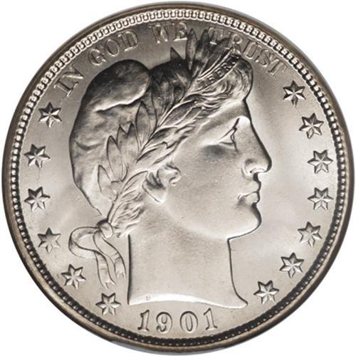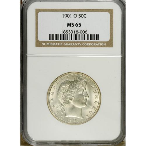 <B>1901-O 50C MS65 NGC.</B></I> David Lawrence writes in his <I>Complete Guide to Barber Halves</B></I> that the 1901-O is" "Scarce above VG. Edwards regarded this as the second toughest date in the series in Gem fully struck condition." And Kevin Flynn, in his <I>The Authoritative Reference on Barber Half Dollars,</B></I> says of the 1909: " The O-mint halves are very scarce in circulated grades and difficult in mint state." In this regard, NGC and PCGS have seen only about 85 examples in all grades.<BR> Sparkling luster adorns both sides of this lovely Gem, and satiny-like surfaces are devoid of significant marks. Except for some softness in a couple of the star centers and on Liberty's lips, the obverse elements are well struck. Strike sharpness is also visible on most of the reverse, save for weakness in the eagle's neck feathers, on the upper right corner of the shield and the adjacent wing feathers. The 1901-O is typically poorly struck throughout.<BR><BR><b>Shipping:</b> Coins & Currency (<a target="_blank" href="http://www.heritageauctions.com/common/shipping.php">view shipping information</a>)