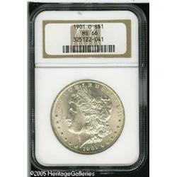 <B>1901-O<img border='0' src='http://www.heritagecoins.com/images/star.gif' width=10 height=10>$1 MS66 NGC.</B></I> One of the more commonly encountered late-date O-mint dollars, this particular '01-O is sharply defined on each side and brilliant throughout with lovely satin-like mint luster.<BR><I>From The Banks Collection.</B></I> Lot:10586