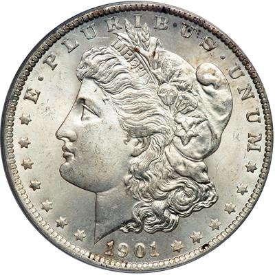 1901-O Morgan Dollar. PCGS graded MS-66. Well struck and frosty with bold design everywhere. Pop 423; 3 finer in 67 (PCGS # 7274).