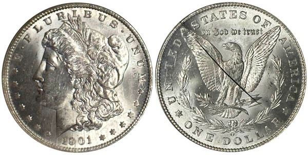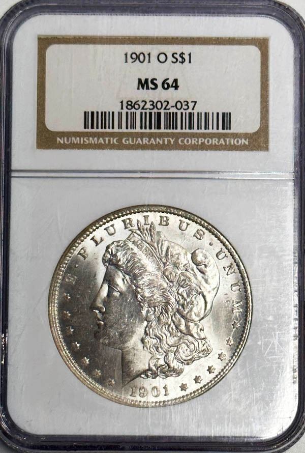 1901-O Morgan Dollar. Holder is cracked on the reverse (the coin is OK). NGC graded MS-64. Greysheet $92, CPG $124.