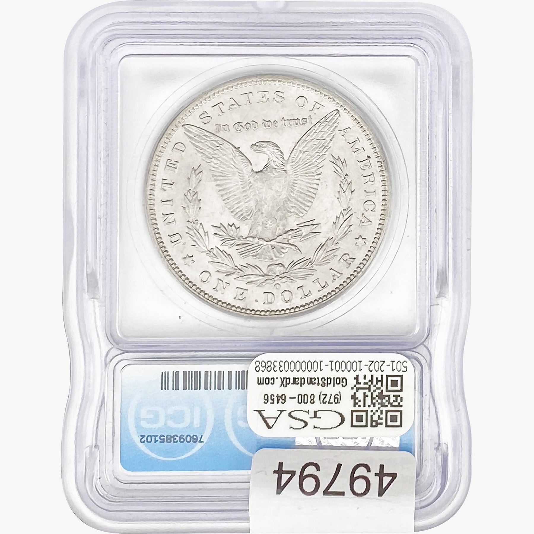 e. Coins sold referencing a third-party grading service are sold “AS IS” without any express or implied warranty, except for a guarantee by GSA that they are genuine. Removal or alteration of the holder, voids all of Bidder’s claims concerning that Product. Certain warranties may be available from the grading services and Bidders are referred to them for further details: Numismatic Guaranty Corporation (NGC), PO Box 4776, Sarasota, FL 34230, www.ngccoin.com/services/writtenguarantee.asp; Professional Coin Grading Services (PCGS), PO Box 9458, Newport Beach, CA 92658, www.pcgs.com/guarantee.html; ANACS, 6555 S. Kenton St., Ste. 303, Englewood, CO 80111; and Independent Coin Grading Co. (ICG), 7901 East Bellview, Ave., Suite 50, Englewood, CO 80111.
