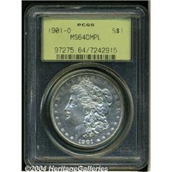 <B>1901-O<S$1> MS64 Deep Mirror Prooflike PCGS.</B></I> Untoned and remarkably bold for this often mushy New Orleans issue, with numerous fine striations in the fields that impart a glassy brilliance. As can be expected of the issue, there is very little frost on the devices and, as a result, contrast is relatively limited. Trivial contact marks are generally confined to the area of Liberty's cheek and the field to her left. Only a tiny percentage of '01-O dollars exhibit deeply mirrored fields. <BR><BR><B>Important notice:</B> Heritage usually auctions material at the rate of 200-250 lots per hour. On some occasions eBay Live bid software or the Internet may not be able to keep up with the pace of the auction. We recommend placing a realistic absentee bid now as insurance to avoid disappointment. Occasionally the auctioneer may eliminate or reject an eBay Live bid, and the auctioneer may also reopen a lot after the close of the eBay live bidding (usually because we missed an audience bid), and may reject your bid even if it shows you as the winning bidder. By bidding via eBay Live, you agree that Heritage may award the lot to another bidder at its sole discretion under the circumstances described above or any other reasonable circumstances. Since eBay bids are not shown to us until we open the lot on the floor, we treat those bids just like floor bids. In most cases the floor responds before the eBay bid is presented to us, due to Internet lag time, so for consistency we have made it a policy that floor bids are always considered first over tie eBay live bids. Also please note that all Heritage lots purchased through eBay Live carry a 20% Buyer's Premium. Please make sure you read the Terms and Conditions before you bid.