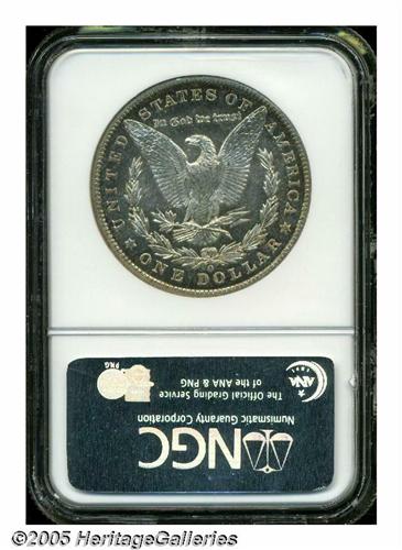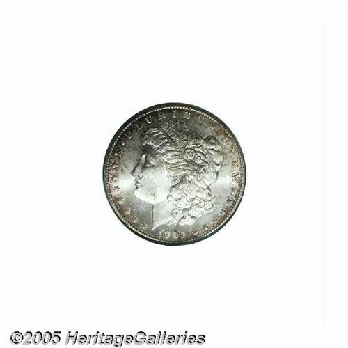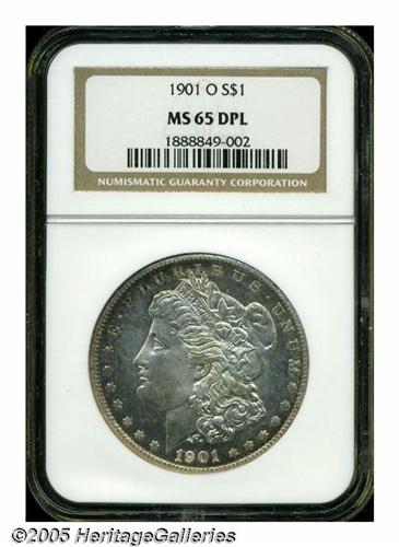 <B>1901-O<S$1> MS65 Deep Mirror Prooflike NGC.</B></I> Surprisingly scarce in Gem condition and with deeply mirrored fields, there have only been 22 other pieces that have been so graded by NGC with one coin finer (6/05). Some russet and blue toning shows at the peripheries with flashy, deeply reflective fields. There is very little contrast evident between the fields and devices. Well struck.