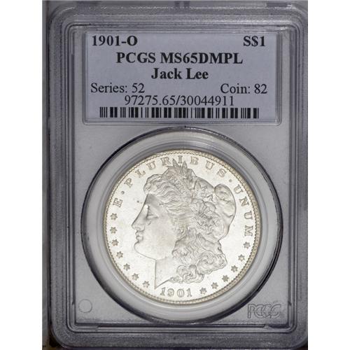 <B>1901-O<img border='0' src='http://www.heritagecoins.com/images/star.gif' width=10 height=10>$1> MS65 Deep Mirror Prooflike PCGS.</B></I> Ex: Jack Lee. This faintly toned and lustrous Gem is surprisingly unabraded, even for the demanding MS65 grade. The strike is razor-sharp in the centers, and the remainder of the design is also bold. Gorgeously preserved, since the only detectable imperfection is a mint-made minor retained lamination beneath the O in GOD. Population: 11 in 65 DMPL, 0 finer (1/06).<BR><I>From The Michael Casper Collection, Part Three.</B></I>
