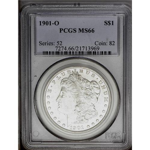 <B>1901-O<img border='0' src='http://www.heritagecoins.com/images/star.gif' width=10 height=10>$1> MS66 PCGS.</B></I> Fully lustrous surfaces are nearly untoned, save for an occasional wisp of light tan color, especially on the reverse. The design elements are adequately struck, and just a few minor marks on the cheek are mentioned for accuracy. The '01-O is significantly less available above the Premium Gem level, as indicated by only three examples having been certified higher (3/06). <BR><BR><B>Important notice:</B> Heritage usually auctions material at the rate of 200-250 lots per hour. On some occasions eBay Live bid software or the Internet may not be able to keep up with the pace of the auction. We recommend placing a realistic absentee bid now as insurance to avoid disappointment. Occasionally the auctioneer may eliminate or reject an eBay Live bid, and the auctioneer may also reopen a lot after the close of the eBay live bidding (usually because we missed an audience bid), and may reject your bid even if it shows you as the winning bidder. By bidding via eBay Live, you agree that Heritage may award the lot to another bidder at its sole discretion under the circumstances described above or any other reasonable circumstances. Since eBay bids are not shown to us until we open the lot on the floor, we treat those bids just like floor bids. In most cases the floor responds before the eBay bid is presented to us, due to Internet lag time, so for consistency we have made it a policy that floor bids are always considered first over tie eBay live bids. Also please note that all Heritage lots purchased through eBay Live carry a 20% Buyer's Premium. Please make sure you read the Terms and Conditions before you bid. This lot is being auctioned in conjunction with a live floor auction by Heritage Galleries & Auctioneers. All final auction and invoice information will be supplied by Heritage Galleries & Auctioneers, and all other information should be considered preliminary. Lot:3761 <BR><BR><B>Winning Notification and Billing:</B> After the FINAL session in this auction is complete, Heritage will send e-mail and snail mail invoices. This process normally takes several days. All final auction and invoice information will be supplied by Heritage Galleries & Auctioneers, and all other information should be considered preliminary. <BR><BR>This auction will be conducted on a live auction floor and over the Internet through eBay Live. If you choose to place an absentee bid, please take a moment to <font color='#0000ff'><u><a href='http://pages.ebay.com/liveauctions/help/before/laabsentee.html'>learn how eBay Live absentee bidding works</a></u></font><font color='#000000'>