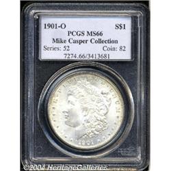 <B>1901-O<S$1> MS66 PCGS.</B></I> Ex: Mike Casper Collection. Luster blasts through the blanket of medium pearl-gray patina. A nicely struck and exceptionally preserved premium Gem. As of (3/04), PCGS has only certified three examples finer. <BR><BR><B>Important notice:</B> Heritage usually auctions material at the rate of 200-250 lots per hour. On some occasions eBay Live bid software or the Internet may not be able to keep up with the pace of the auction. We recommend placing a realistic absentee bid now as insurance to avoid disappointment. Occasionally the auctioneer may eliminate or reject an eBay Live bid, and the auctioneer may also reopen a lot after the close of the eBay live bidding (usually because we missed an audience bid), and may reject your bid even if it shows you as the winning bidder. By bidding via eBay Live, you agree that Heritage may award the lot to another bidder at its sole discretion under the circumstances described above or any other reasonable circumstances. Since eBay bids are not shown to us until we open the lot on the floor, we treat those bids just like floor bids. In most cases the floor responds before the eBay bid is presented to us, due to Internet lag time, so for consistency we have made it a policy that floor bids are always considered first over tie eBay live bids. Also please note that all Heritage lots purchased through eBay Live carry a 20% Buyer's Premium. Please make sure you read the Terms and Conditions before you bid.